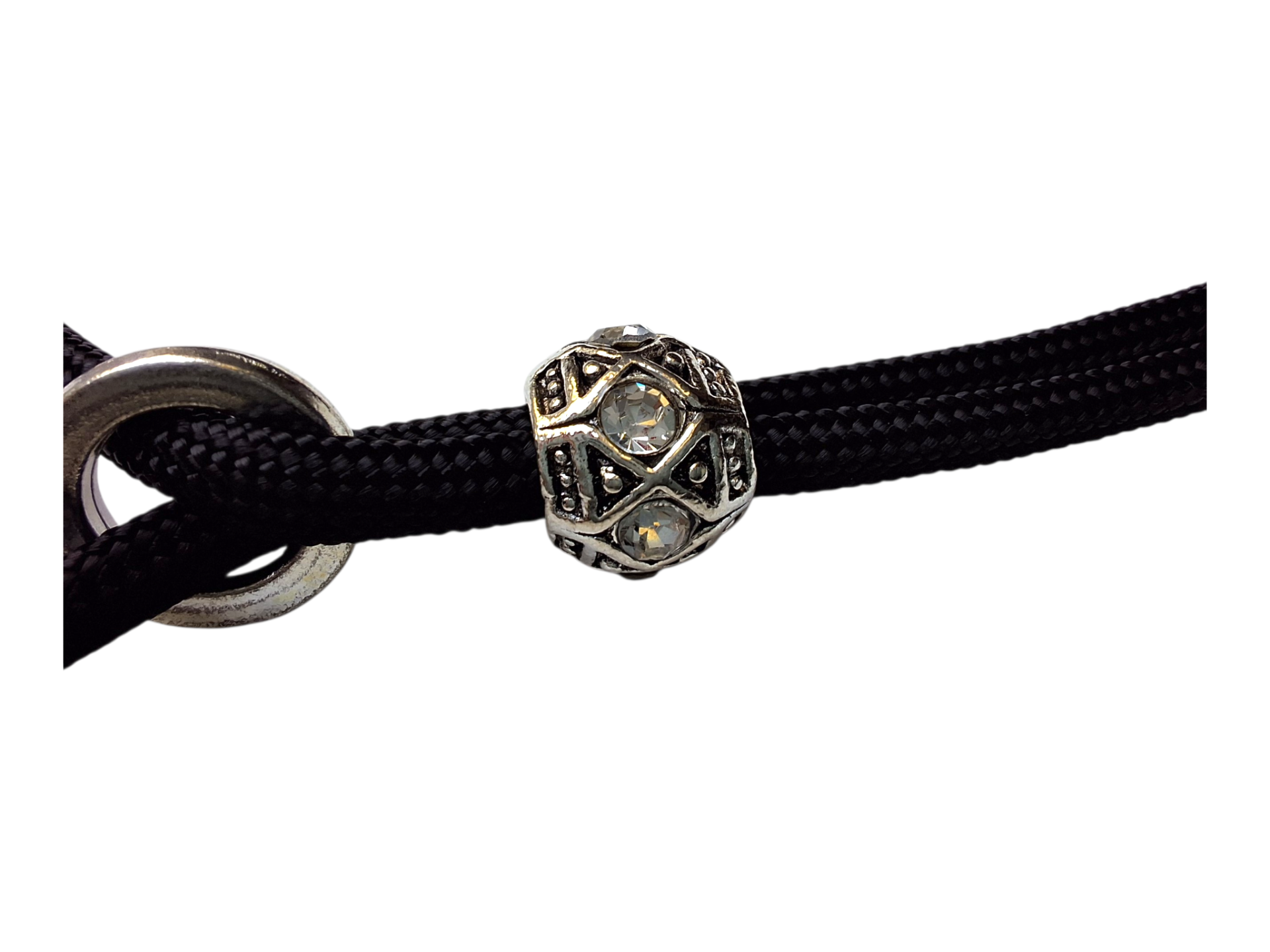 Het ringetje sluit aan in de nek en de kraal voorkomt dat de lijn open schuift.
